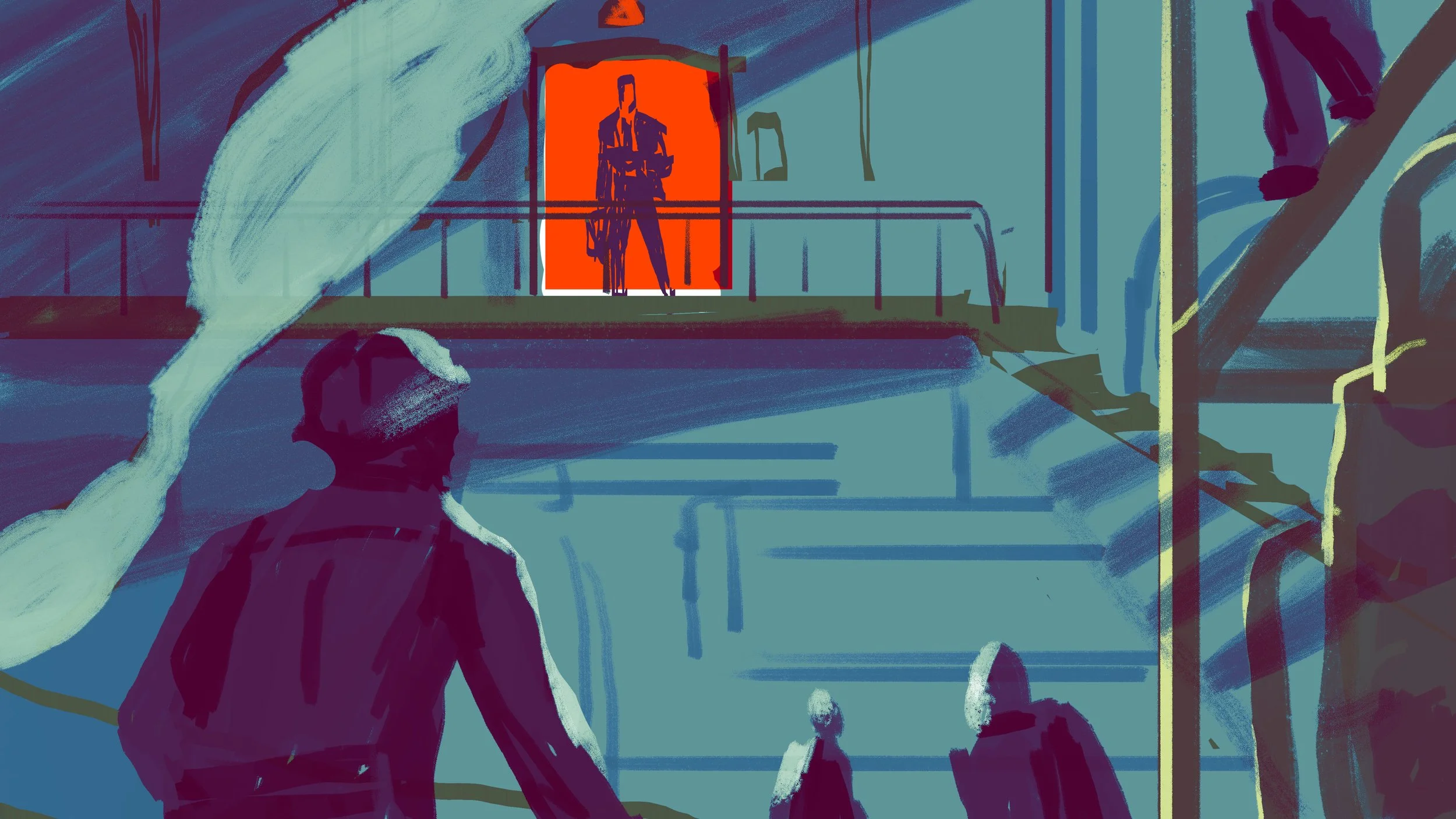 I took some time to consider how best to depict the apathy regarding the climate and depicting a depressing, futuristic, industrial landscape. It also felt vital to me to think about the people affected and the insidious lies told to workers to continue their exploitation. As this was part of a series of 4 stories, I tried to keep a common thread throughout each of the pieces to unite them, and decided it was to be the bright, warning red.